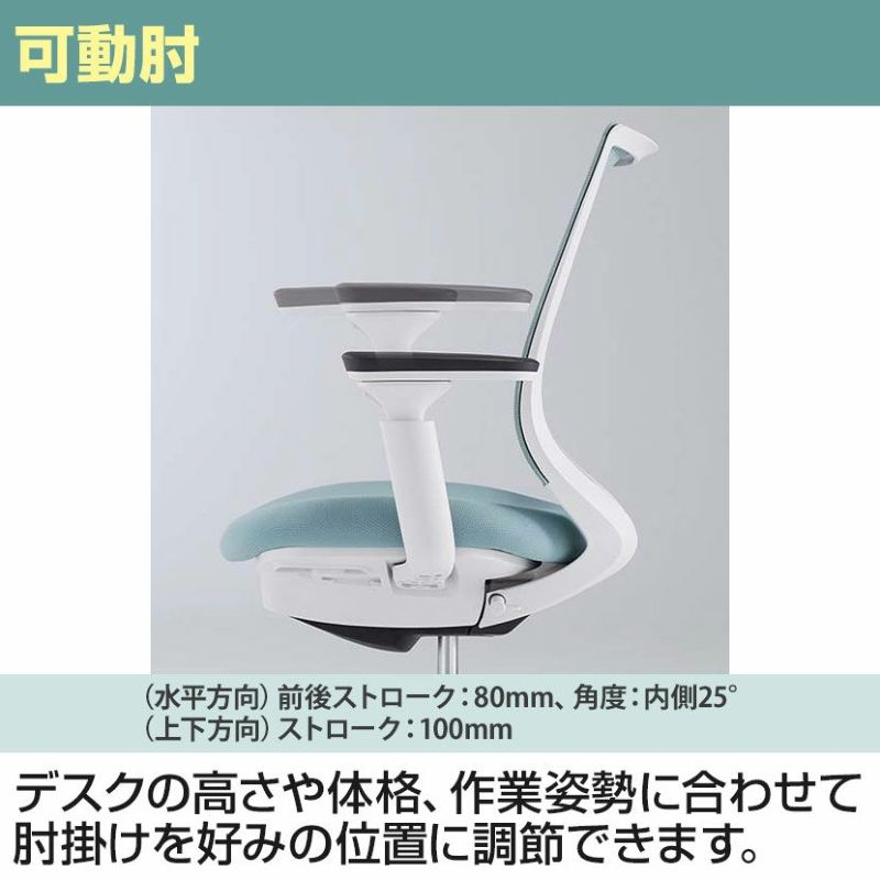 | 機能 | ・座面高さ調整(90mmストローク) ・座面奥行調整(50mmストローク) ・オートフィットシンクロロッキング バランスをとりやすい反力特性に自動的に調整します。 ・ロッキング反力簡易調節(5段階) ・ロッキング角度範囲調節(0度、6度、13度、20度) ・肘位置調整 上下ストローク100mm、前後ストローク80mm、角度内側25度で調整可能。 |