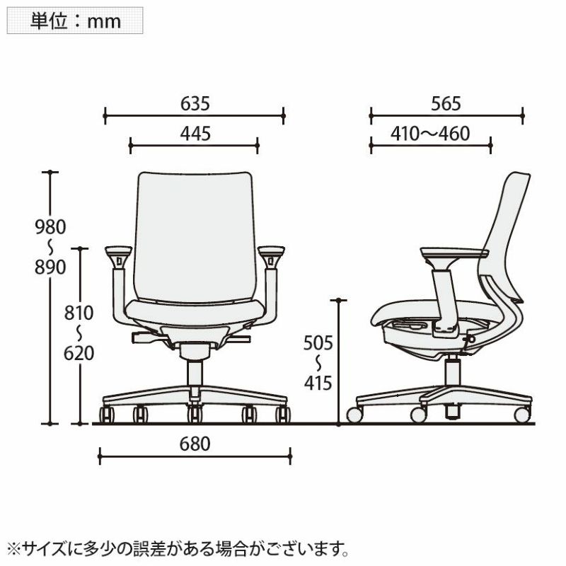 | サイズ | 外寸 / 幅680×奥行680×高さ890~980mm 座面 / 幅445×奥行410~460mm 座面高さ / 415~505mm 肘高さ / 620~810mm |