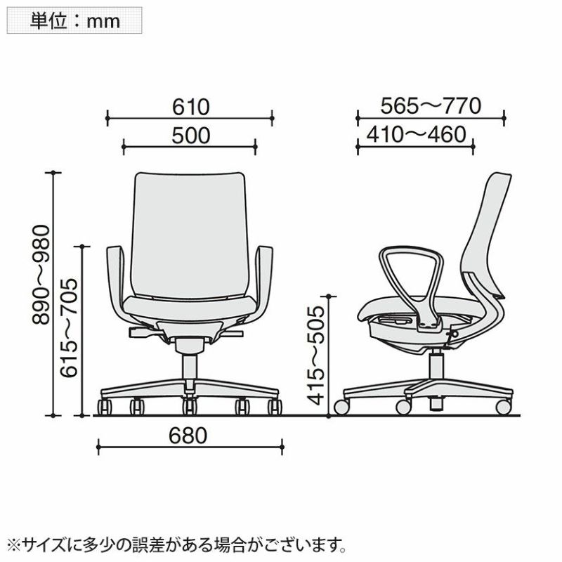 | サイズ | 外寸 / 幅680×奥行680×高さ890~980mm 座面 / 幅460×奥行410~460mm 座面高さ / 415~505mm 肘高さ / 615~705mm |