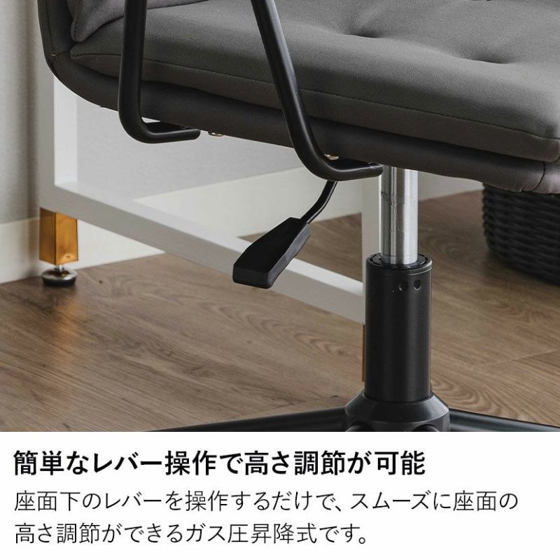 座面下のレバーを操作するだけで、スムーズに座面の高さ調節ができるガス圧昇降式です。