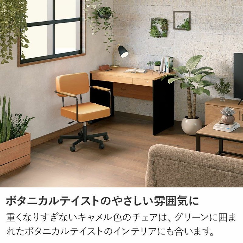 重くなりすぎないキャメル色のチェアは、グリーンに囲まれたボタニカルテイストのインテリアにも合います。