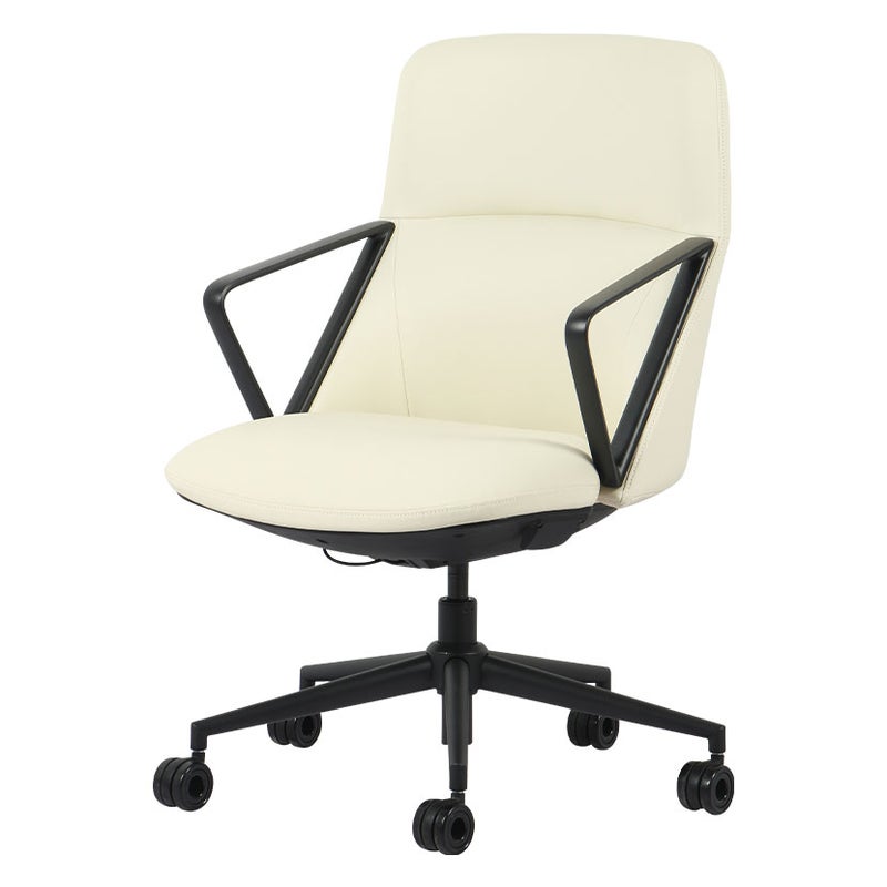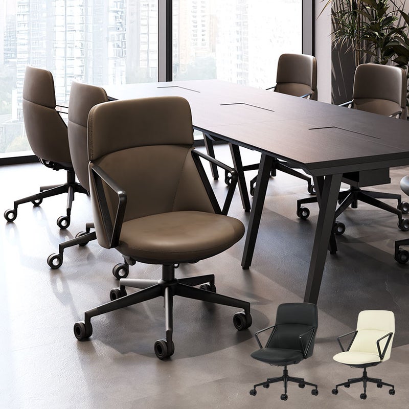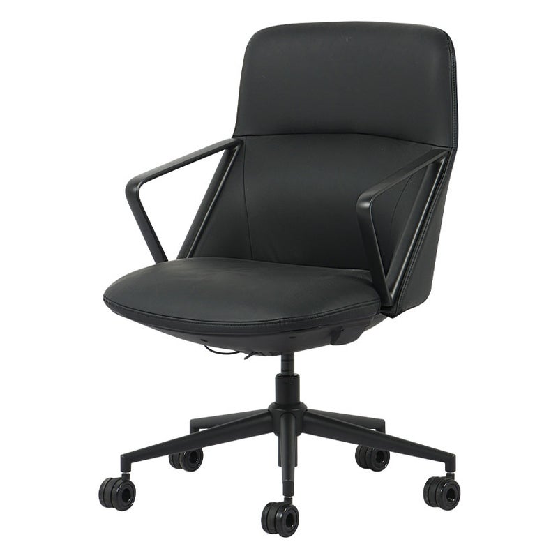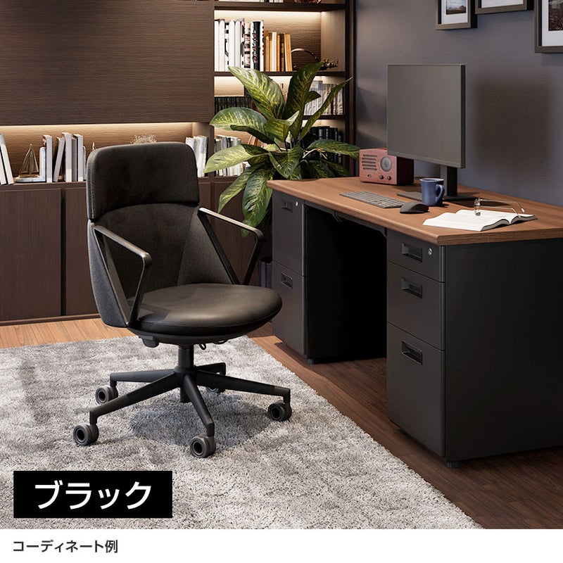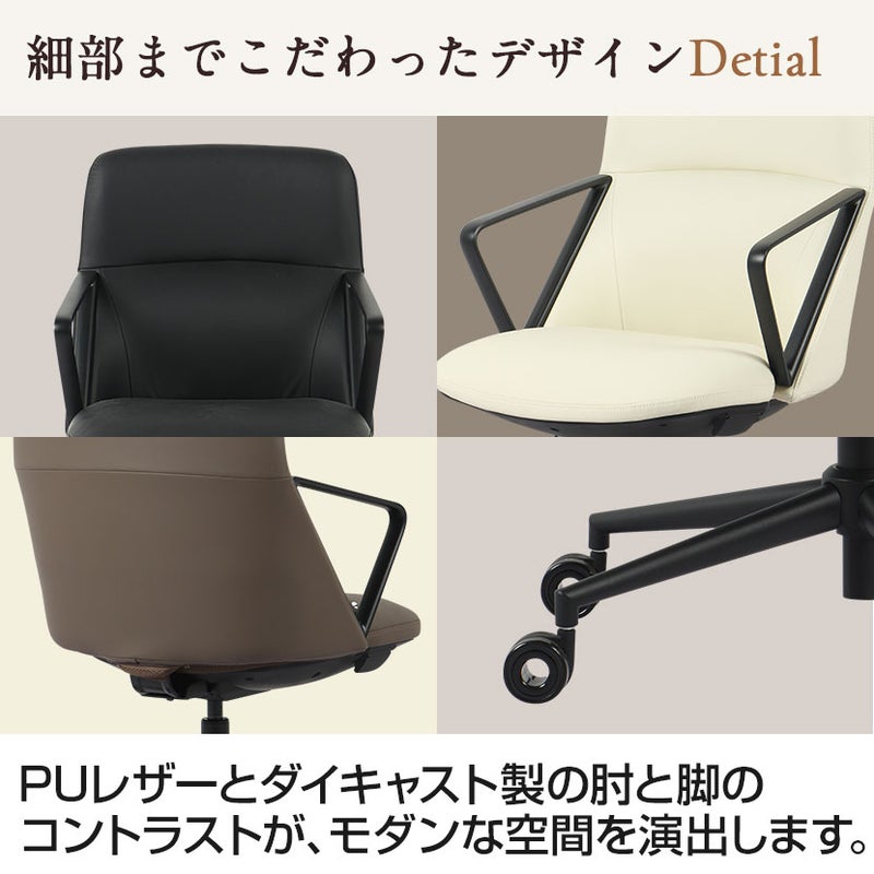 PUレザーとダイキャスト製の肘と脚のコントラストが、モダンな空間を演出します。