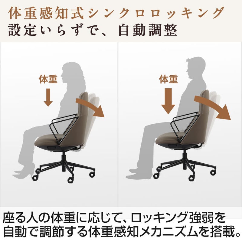 座る人の体重に応じて、ロッキング強弱を自動で調節する体重感知メカニズムを搭載しています。