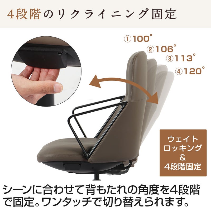 シーンに合わせて背もたれの角度を4段階で固定。ワンタッチで切り替えられます。