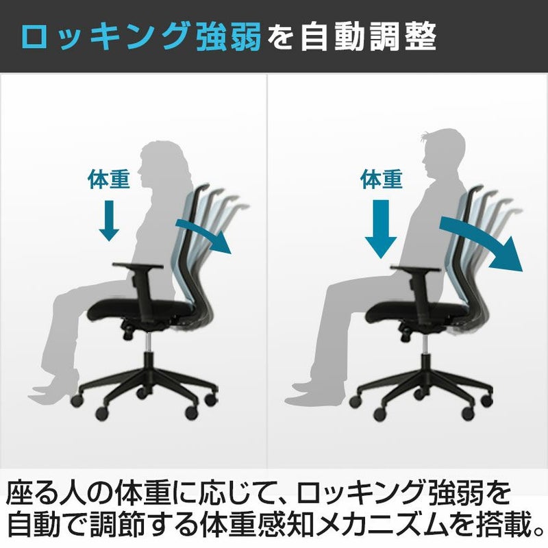 座る人の体重に応じて、背もたれのロッキングの強さを自動で調節する体重感知メカニズムを搭載。