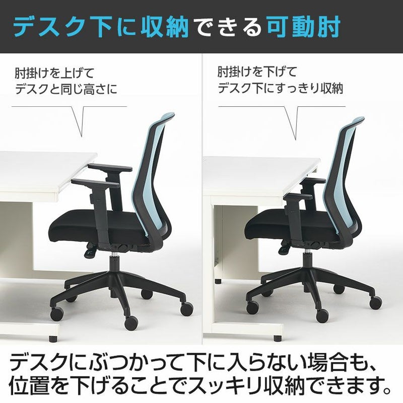 肘ありは腕をサポートし、肘なしはデスク下に収まり見た目もすっきり。
