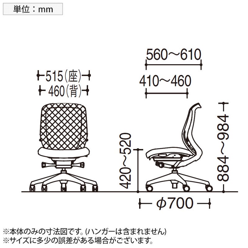 | サイズ(本体) | 外寸 / 幅515×奥行560~610×高さ884~984mm 座面高さ / 420~520mm 脚 / 直径700mm |