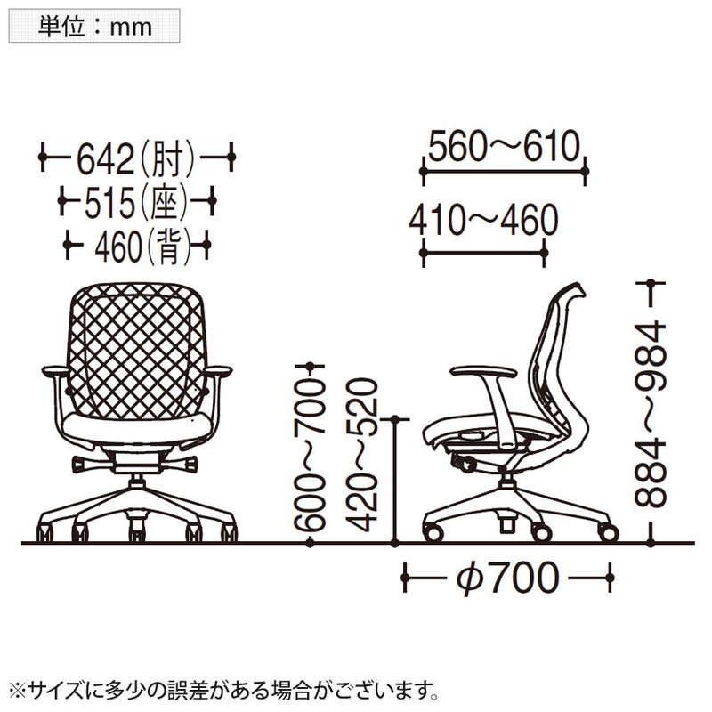 | サイズ(本体) | 外寸 / 幅642×奥行560~610×高さ884~984mm 座面高さ / 420~520mm 脚 / 直径700mm |