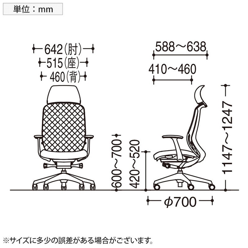 | サイズ(本体) | 外寸 / 幅642×奥行588~638×高さ1147~1247mm 座面高さ / 420~520mm 脚 / 直径700mm |