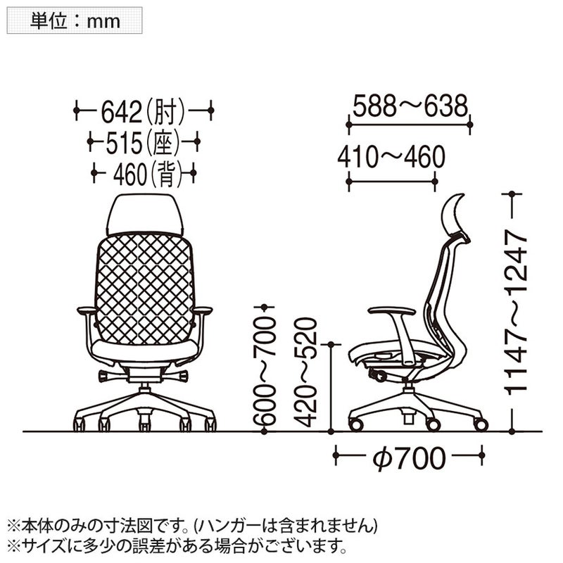 | サイズ(本体) | 外寸 / 幅642×奥行588~638×高さ1147~1247mm 座面高さ / 420~520mm 脚 / 直径700mm |