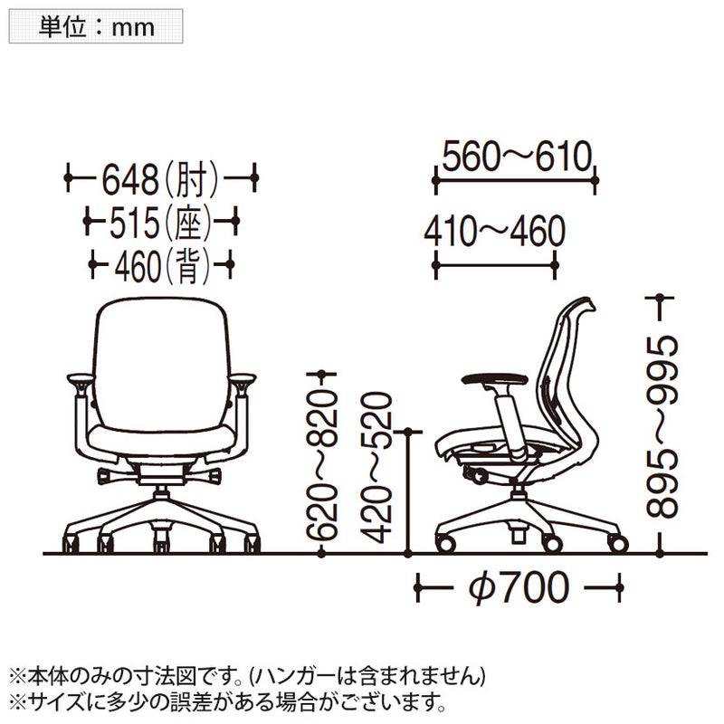 | 機能・特徴 | ・バックカーブアジャスト機構 背もたれのカーブを2段階で調節可能 ・前傾機能付き背座シンクロリクライニング 角度 / 33度(前傾10度、後傾23度) 4段階固定可能 強弱調節可能 ・アジャストアーム(上下100mm、前後50mm、内側20度、外側20度) ・座面高さ調節(ストローク100mm) ・座面奥行調節(ストローク50mm) ・ハンガー高さ調節(ストローク120mm) |