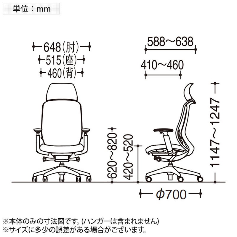 | 機能・特徴 | ・バックカーブアジャスト機構 背もたれのカーブを2段階で調節可能 ・前傾機能付き背座シンクロリクライニング 角度 / 33度(前傾10度、後傾23度) 4段階固定可能 強弱調節可能 ・アジャストアーム(上下100mm、前後50mm、内側20度、外側20度) ・座面高さ調節(ストローク100mm) ・座面奥行調節(ストローク50mm) ・ハンガー高さ調節(ストローク120mm) |