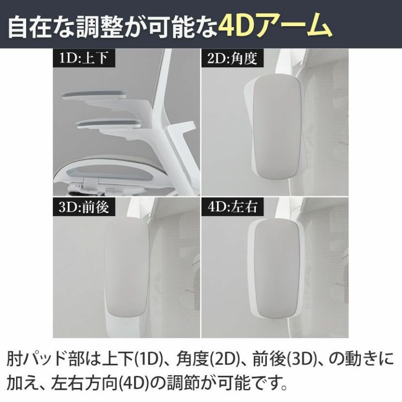 | 機能・特徴 | ・アンクルチルトリクライニング(リクライニング角度23度) くるぶしの動きを中心として背と座がシンクロしてスライドします。 ・アジャストアーム(4Dアーム) 肘パッド部の上下100mm(1D)、角度は内側15度、外側7.5度(2D)、 前後50mm(3D)、左右方向25mmずつ(4D)の調節が可能です。 ・座面高さ調節(ストローク100mm) ・座面奥行き調整(ストローク50mm) ・リクライニングの固定・解除 ・リクライニング反発力強弱調整 |