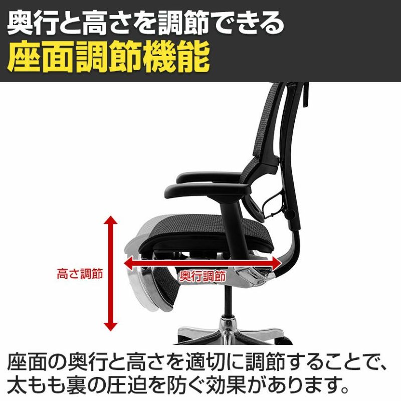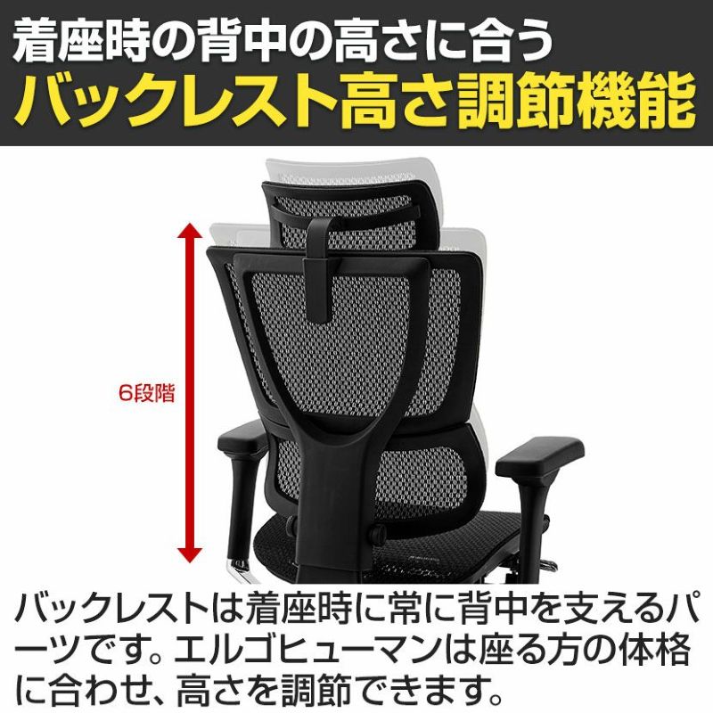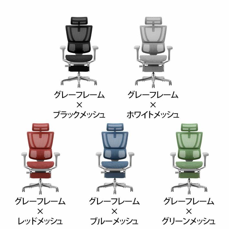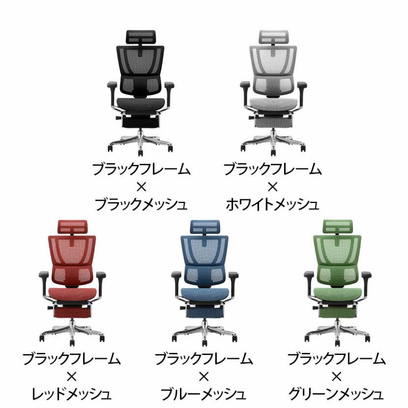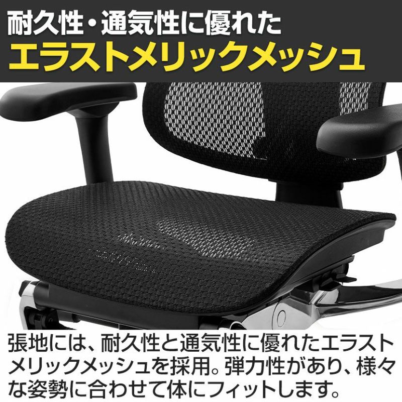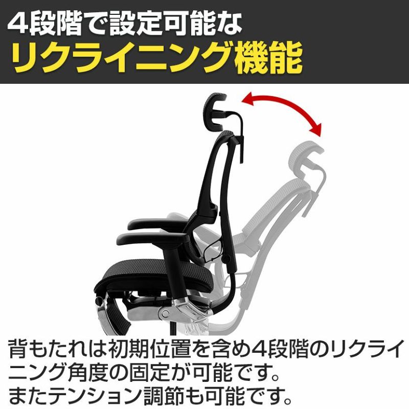 | 機能・特徴 | ・ヘッドレスト(高さ、角度調節可能) ・リクライニング(4段階) ・メモリーロッキング(110度~138度) リクライニングした際の最大傾斜角度を設定できます。 ・バックレスト高さ調節(6段階) ・独立式ランバーサポート(硬さ調節可能) ・4Dアームレスト(高さ、角度、水平横、奥行調節可能) ・前傾チルト 座面をわずかに傾斜させると骨盤が立ち姿勢が安定します。 ・座面高さ調節 ・座面奥行調節 ・収納式オットマン |