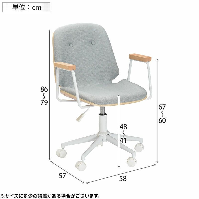 | サイズ | 外寸 / 幅580×奥行570×高さ790~860mm 座面高さ / 410~480mm 肘高さ / 600~670mm |