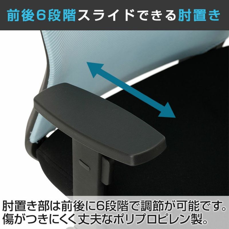 肘置き部は前後にスライドし、6段階で調節が可能。