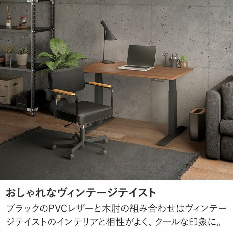 ブラックのPVCレザーと木肘の組み合わせはヴィンテージテイストのインテリアと相性がよく、クールな印象になります。
