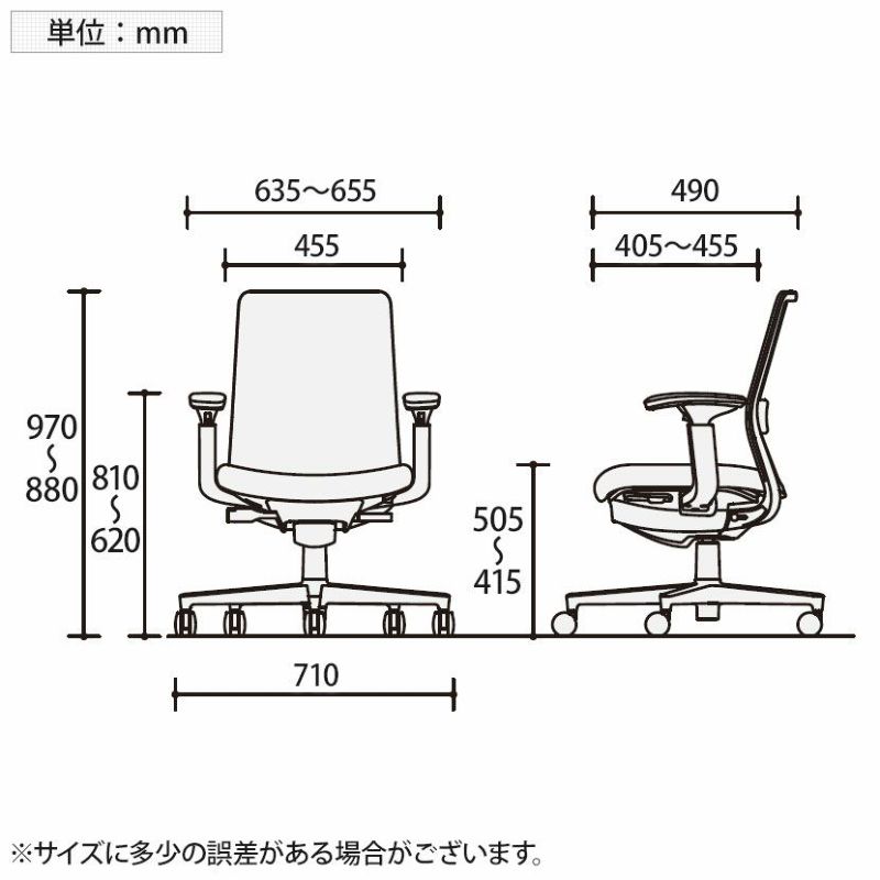 | サイズ(本体) | 外寸 / 幅710×奥行710×高さ880~970mm 座面 / 幅455×奥行405~455mm 座面高さ / 415~505mm 肘高さ / 620~810mm |