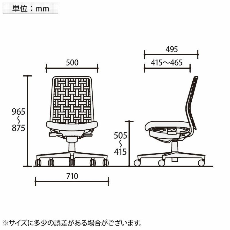 | サイズ(本体) | 外寸 / 幅710×奥行710×高さ875~965mm 座面 / 幅500×奥行415~465mm 座面高さ / 415~505mm |