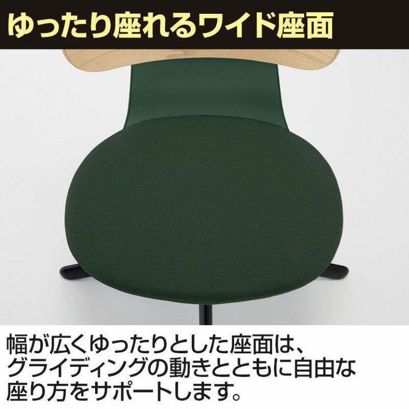 | 機能・特徴 | ・ガス圧昇降式 ・グライディング・メカ バランスボールに座っている感覚で座面が360度自由に動きます。 背骨をS字形状にサポートし、自然に働きやすい姿勢に整えます。 グライディング固定機能なし ・3Dポスチャーサポートシート 体圧分散を適正にするとともに、前傾時の体の滑り落ちも防ぎます。 ・ローバック ・ワイド背もたれ・座面 |