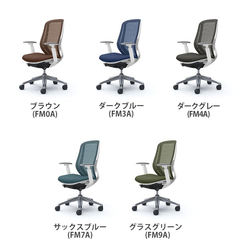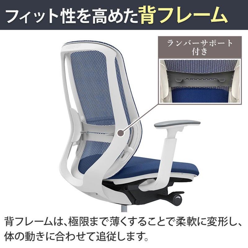 | 機能・特徴 | ・バックカーブアジャスト機構(背もたれのカーブを2段階で調整可能) ・ベンティング機能 カラダと背もたれのフィット感を向上させるため、背タイプに適した形状を採用。 ・前傾機能き背座シンクロリクライニング リクライニング角度33度(前傾10度、後傾23度)、有段階ピッチ固定可能(4段階) リクライニング強弱調整 ・アジャストアーム(上下100mm/前後50mm、角度内側20度、外側20度) ・座面高さ調節(ストローク100mm) ・座面奥行き調整(ストローク50mm) |