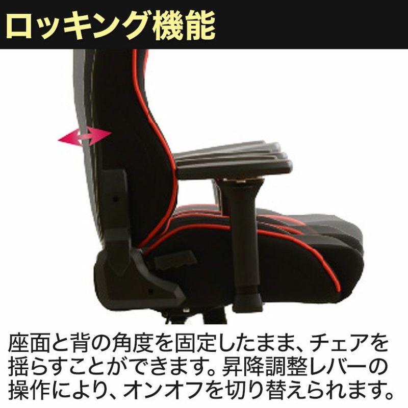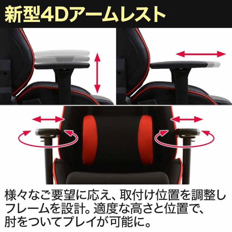 | 機能・特徴 | ・4Dアームレスト 昇降65mm6段階、前後90mm10段階、左右、回転 ・ロッキング機能(強弱調整可能) ・リクライニング機能(160度23段階) ・座面昇降機能 |