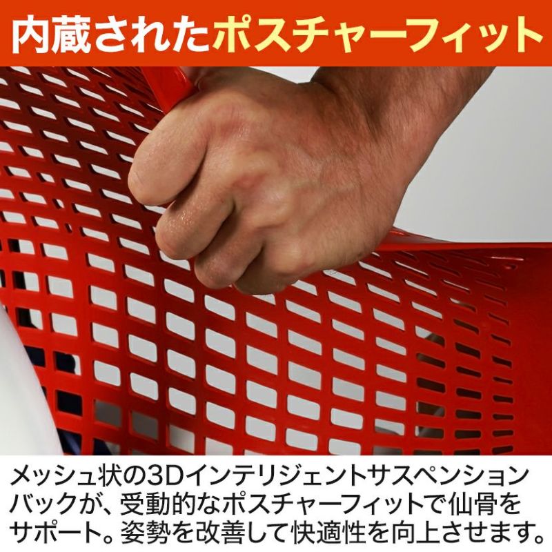 メッシュ状の3Dインテリジェントサスペンションバックが、受動的なポスチャーフィットで仙骨をサポート。腰を少し前傾させて背骨を健全な位置に保ち、姿勢を改善して快適性を向上させます。