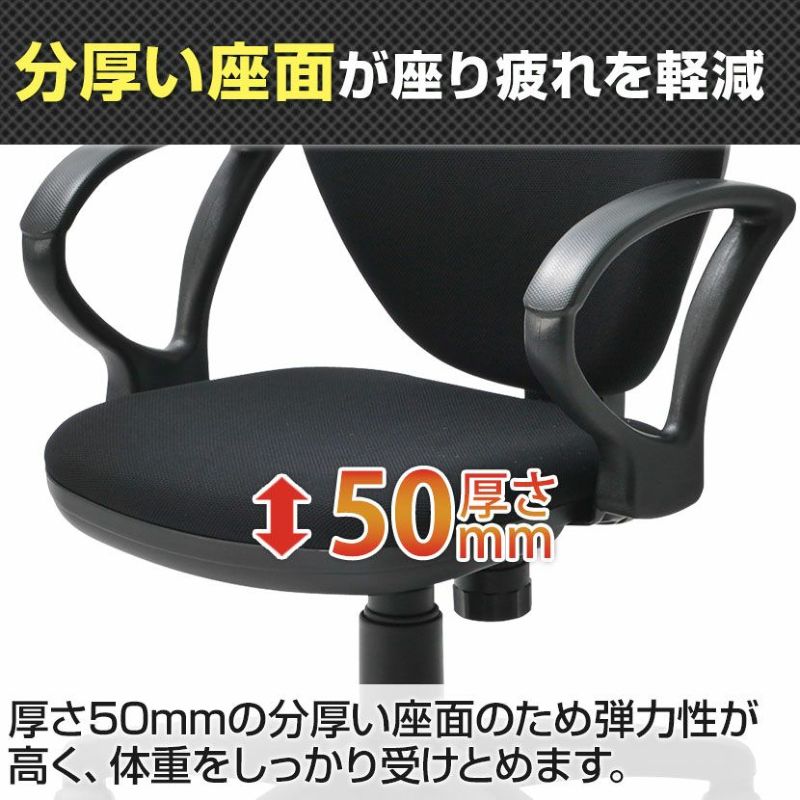 また、ロッキング機能や座面の高さ調節といった基本機能も搭載。両サイドに付いた肘置きは腕のサポート役になり、長時間のデスクワークでも快適に過ごせます。
