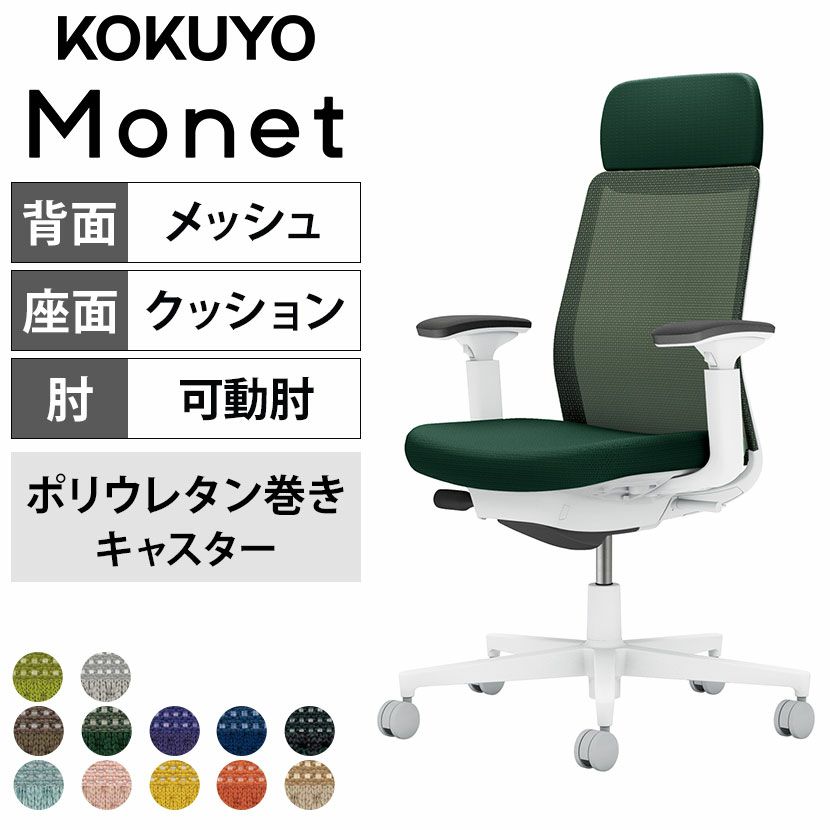 他の画像を見る 【設置無料】 ワークチェア モネット Monet オフィスチェア L字肘(固定肘) ハイバック 樹脂脚 ウレタンキャスター ショルダーサポート付き ランバーサポート付き 背メッシュ 座面布張り 背座同色 本体/脚ブラック C03-B113U コクヨ 椅子 送料無料 送料無料 組立設置付き 組立設置付き 日本製 日本製 ¥ 91,500 税込 詳細を見る