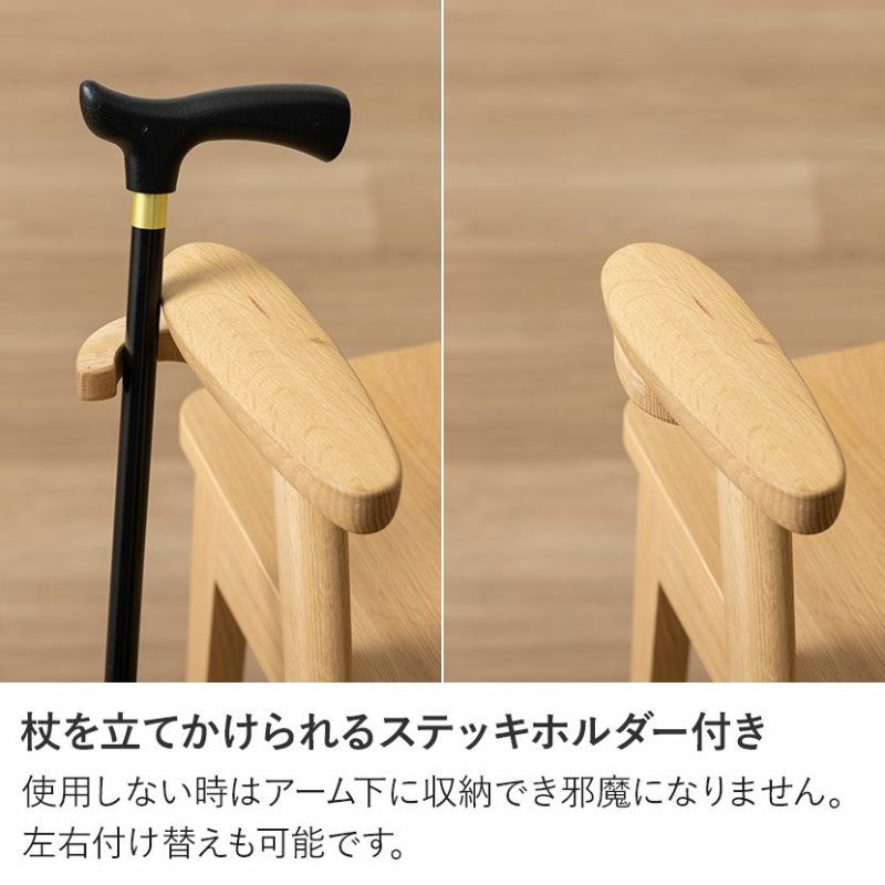 立ちあがりの時に握りやすい両肘がついています。天然木製なので、冬場でもヒンヤリしません。