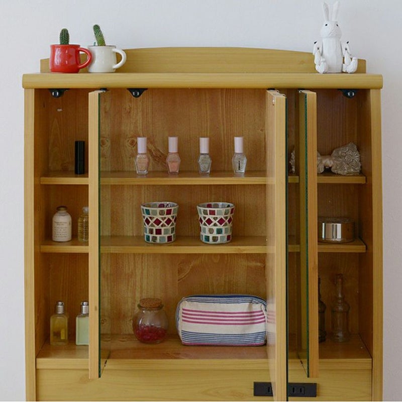 | 内寸 | (引き出し小)幅160×奥行330×高さ65(有効75)mm (引き出し大)幅345×奥行330×高さ65(有効75)mm (ガラス扉内収納部)幅165×奥行365×高さ390mm (左ミラー扉内収納部)幅105×奥行125×高さ470mm (中央ミラー扉内収納部)幅275×奥行125×高さ470mm (右ミラー扉内収納部)幅105×奥行360×高さ470mm (ガラス扉内収納部可動棚)幅190×奥行360×厚み15mm (32mmピッチ5穴) (左・中央ミラー扉内可動棚)幅425×奥行90×厚み12mm (32mmピッチ9穴) (右ミラー扉内可動棚)幅140×奥行90×厚み12mm (32mmピッチ9穴) (スツール収納部)幅300×奥行255×高さ235mm |