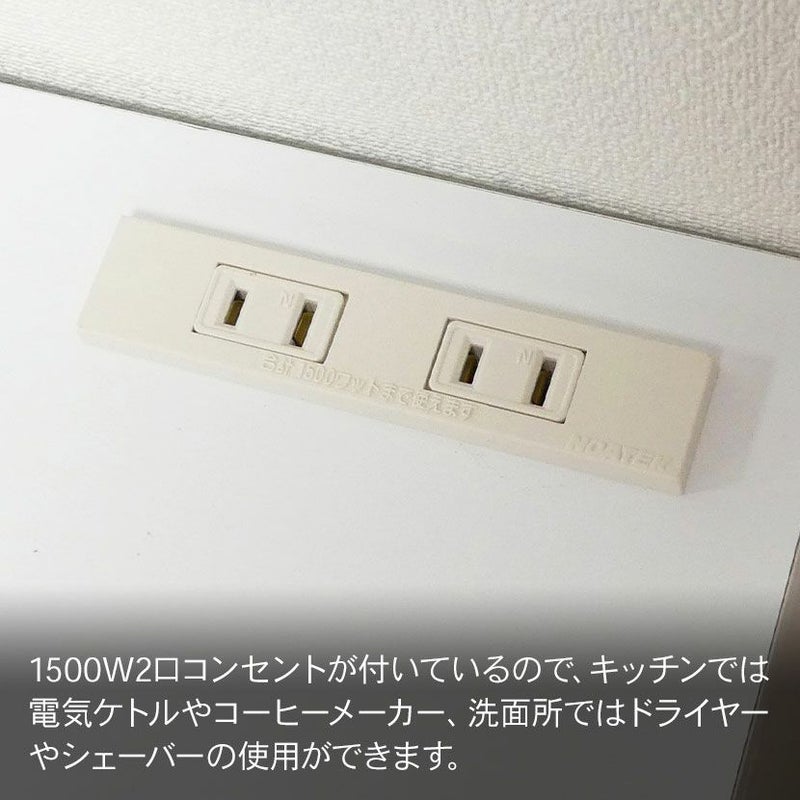 ●1500W2口コンセントが付いているので、キッチンでは電気ケトルやコーヒーメーカー、洗面所ではドライヤーやシェーバーの使用ができます。