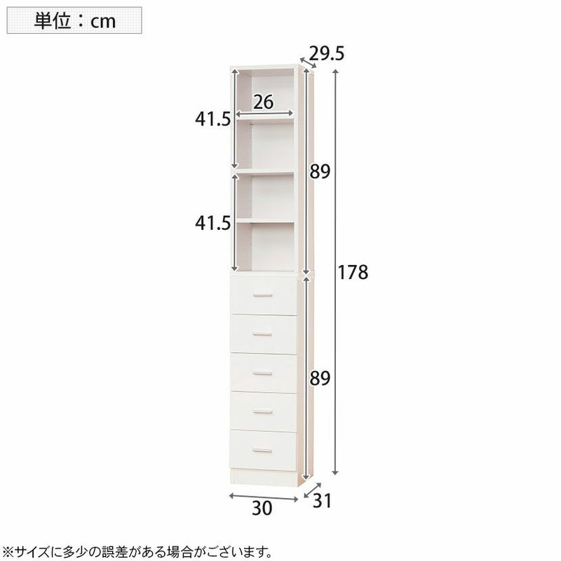 | サイズ | 外寸 / 幅300×奥行310×高さ1780mm 引き出し内寸 / 幅235×奥行235×高さ105mm