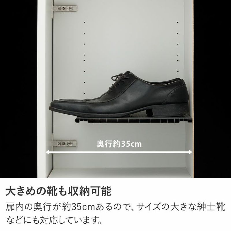 扉内の奥行が約35cmあるので、サイズの大きな紳士靴などにも対応しています。