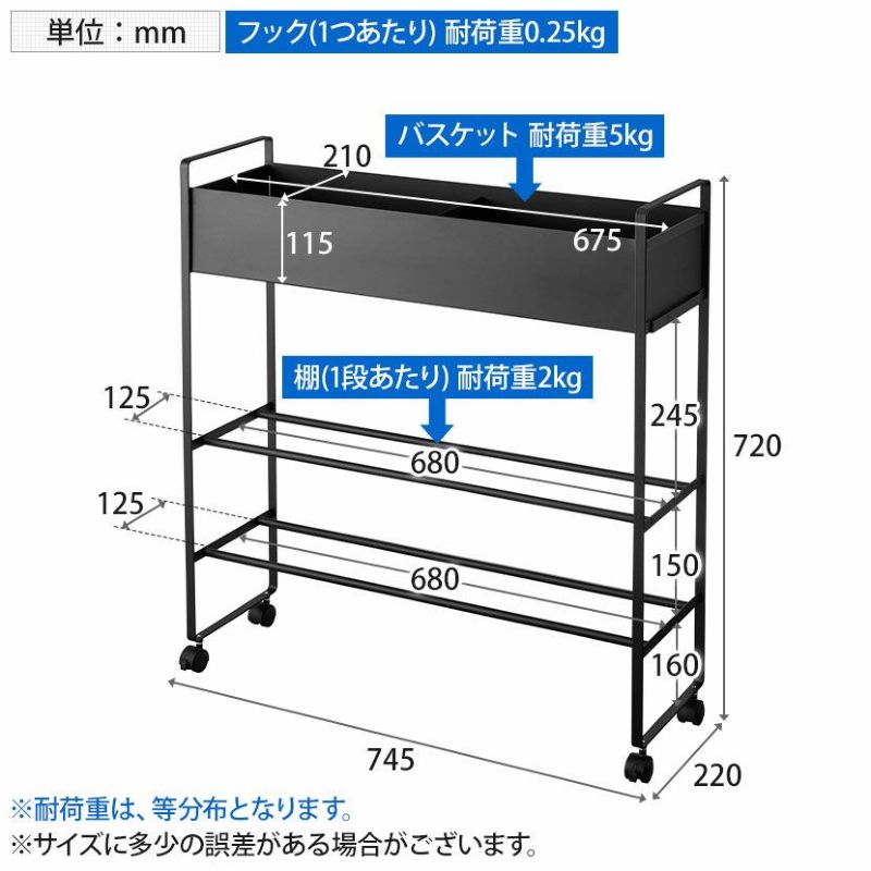 耐荷重 | バスケット / 約5kg 棚(1段あたり) / 約2kg フック(1つあたり) / 約0.25kg |