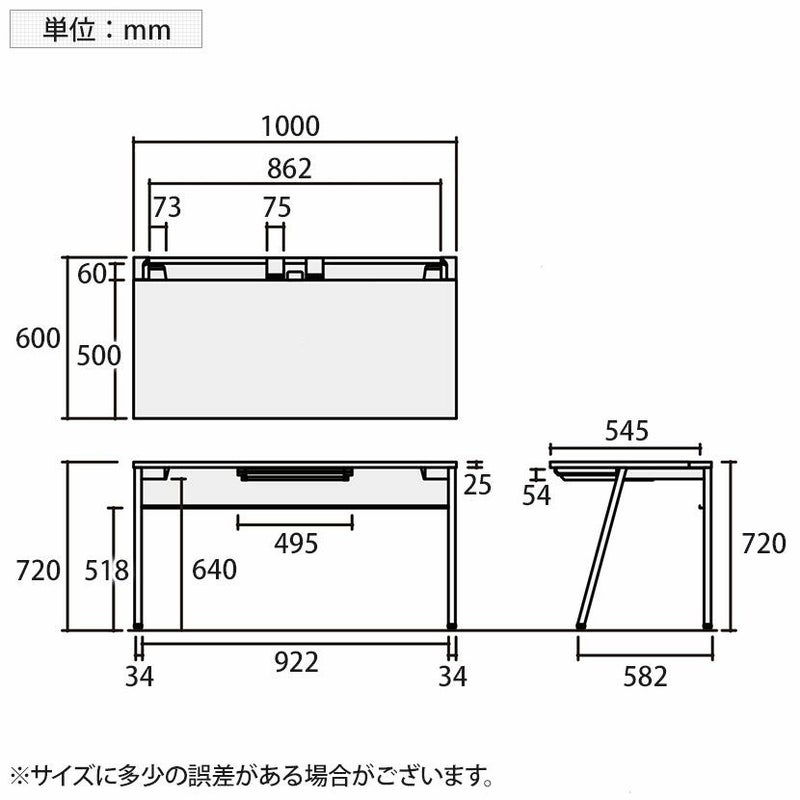 | サイズ(その他) | 天板 / 奥行500×厚さ25mm 引き出し内寸 / 幅425×奥行332×高さ45mm 下肢空間 / 幅922×奥行545×高さ638mm コード受け開口部 / 48mm トレーブロック / 幅75×奥行95×高さ25mm |