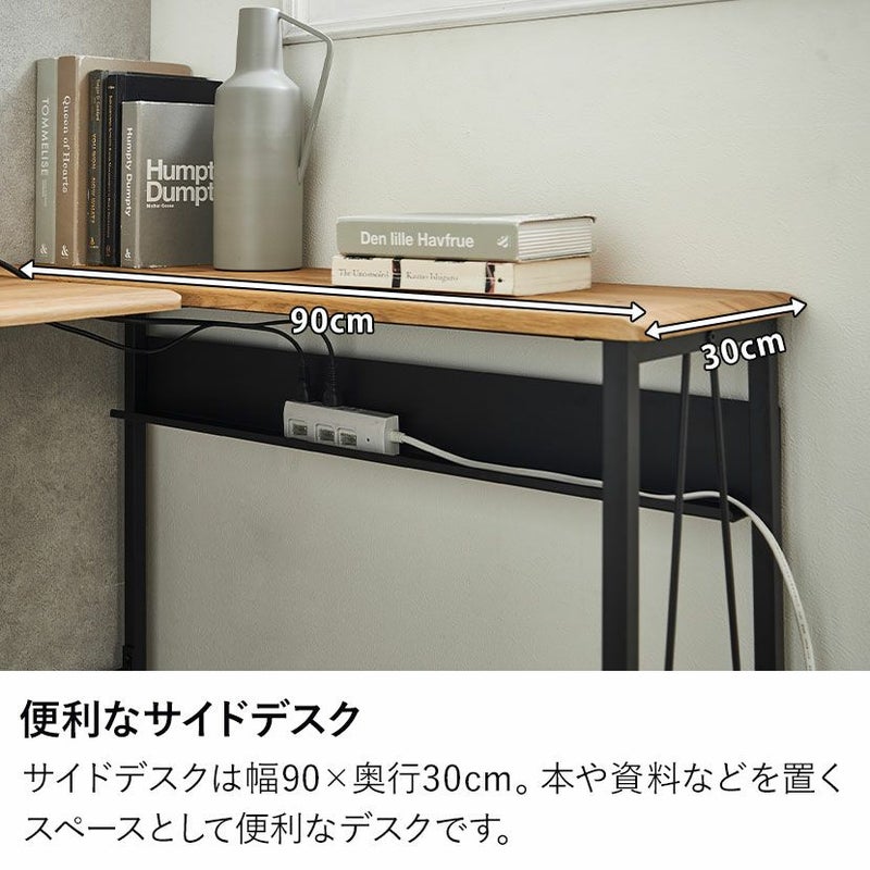 サイドデスクは幅90×奥行30cm。本や資料などを置くスペースとして便利なデスクです。