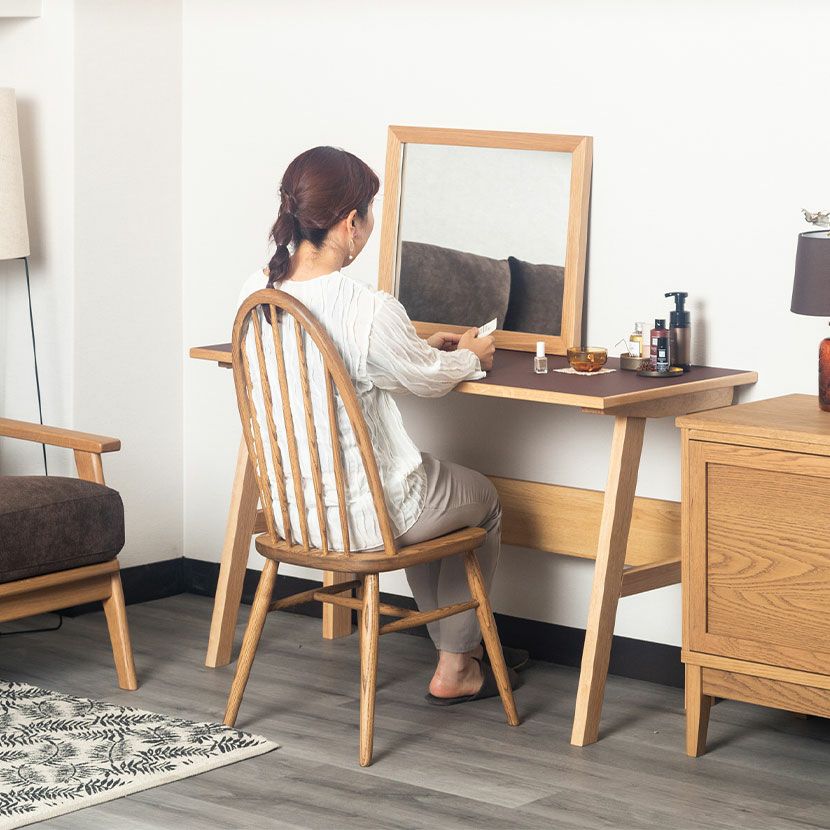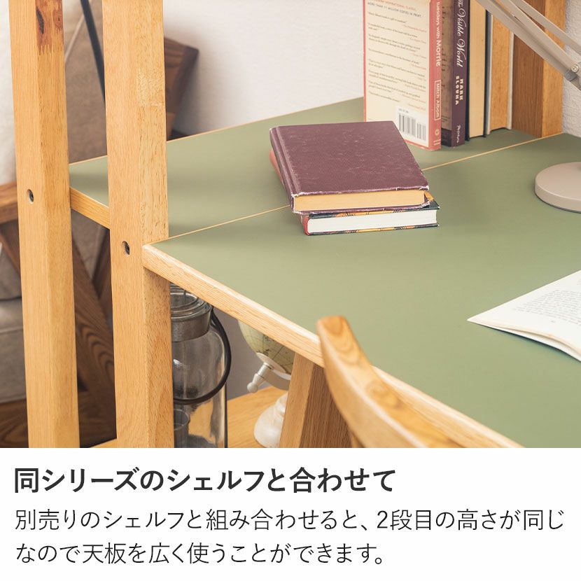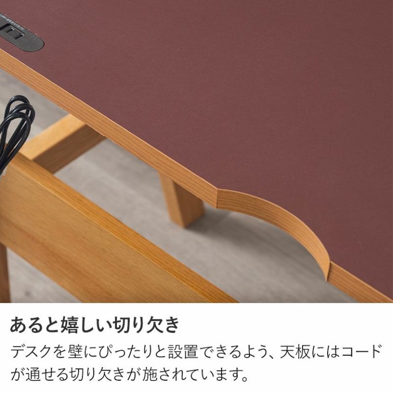 ほとんどの汚れは乾いた布巾もしくはかたく絞った布巾で取ることができます。お手入れのしやすさも魅力の一つです。充電しながら天板には2口コンセントとUSBポート付き。スマホやPCでの作業も快適に行えます。あると嬉しい切り欠きデスクを壁にぴったりと設置できるよう、天板にはコードが通せる切り欠きが施されています。同シリーズのシェルフと合わせて別売りのシェルフと組み合わせると、2段目の高さが同じなので天板を広く使うことができます。
