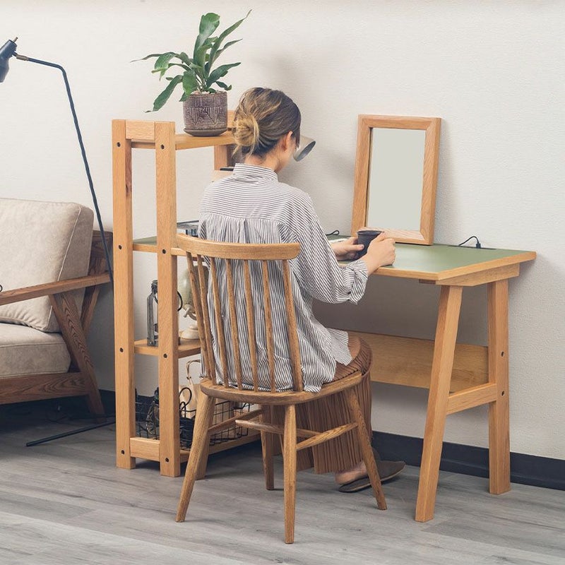 ほとんどの汚れは乾いた布巾もしくはかたく絞った布巾で取ることができます。お手入れのしやすさも魅力の一つです。充電しながら天板には2口コンセントとUSBポート付き。スマホやPCでの作業も快適に行えます。あると嬉しい切り欠きデスクを壁にぴったりと設置できるよう、天板にはコードが通せる切り欠きが施されています。同シリーズのシェルフと合わせて別売りのシェルフと組み合わせると、2段目の高さが同じなので天板を広く使うことができます。