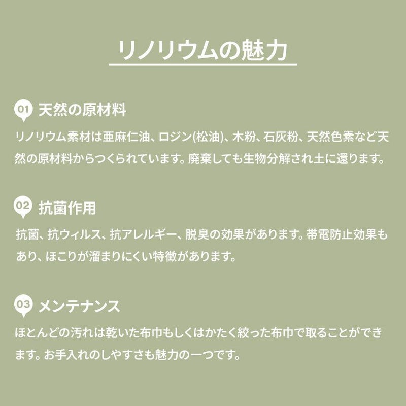 リノリウム素材は亜麻仁油、ロジン(松油)、木粉、石灰粉、天然色素など天然の原材料からつくられています。廃棄しても生物分解され土に還ります。