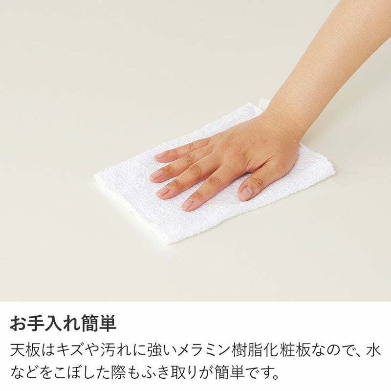 天板はキズや汚れに強いメラミン樹脂化粧板なので、水などをこぼした際もふき取りが簡単です。