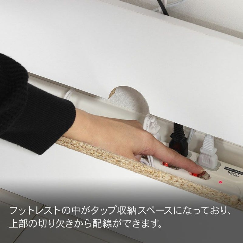 フットレストの中がタップ収納スペースになっており、上部の切り欠きから配線ができます。
