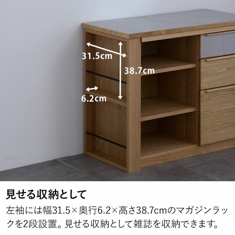 左袖には幅31.5×奥行6.2×高さ38.7cmのマガジンラックを2段設置。見せる収納として雑誌を収納できます。