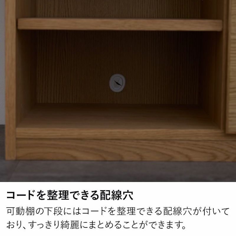 可動棚の下段にはコードを整理できる配線穴が付いており、すっきり綺麗にまとめることができます。