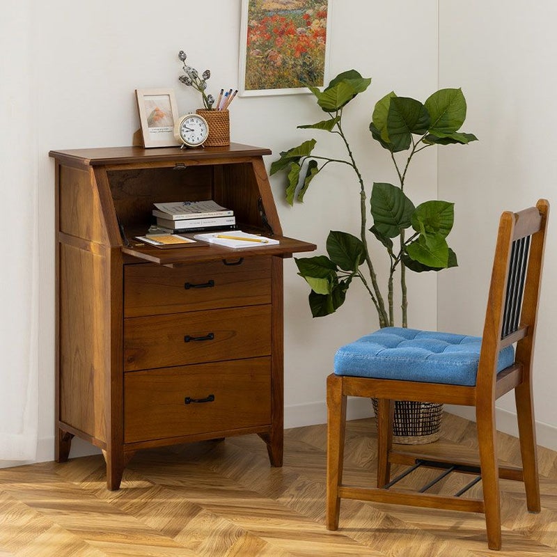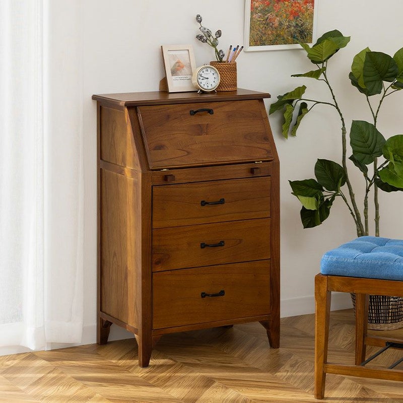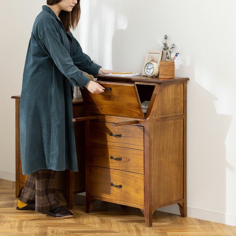 斜めにデザインされた最上段の扉を開くと扉部分が内部とフラットになり、コンパクトなデスクとして使用できます。