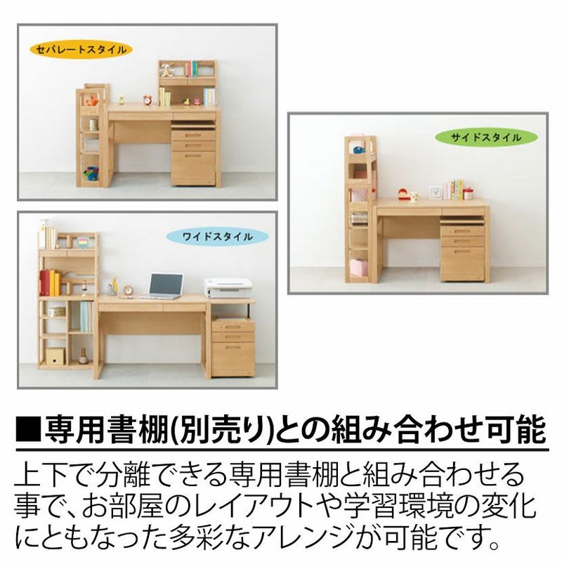 上下で分離できる専用書棚と組み合わせることで、お部屋のレイアウトや学習環境の変化にともなった多彩なアレンジが可能です。