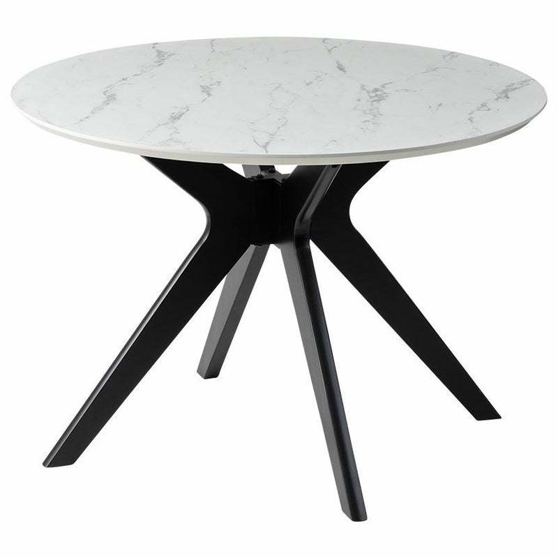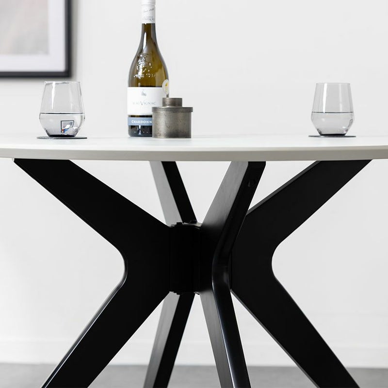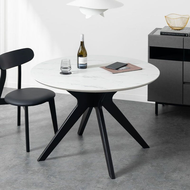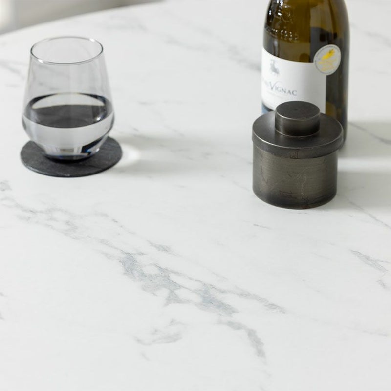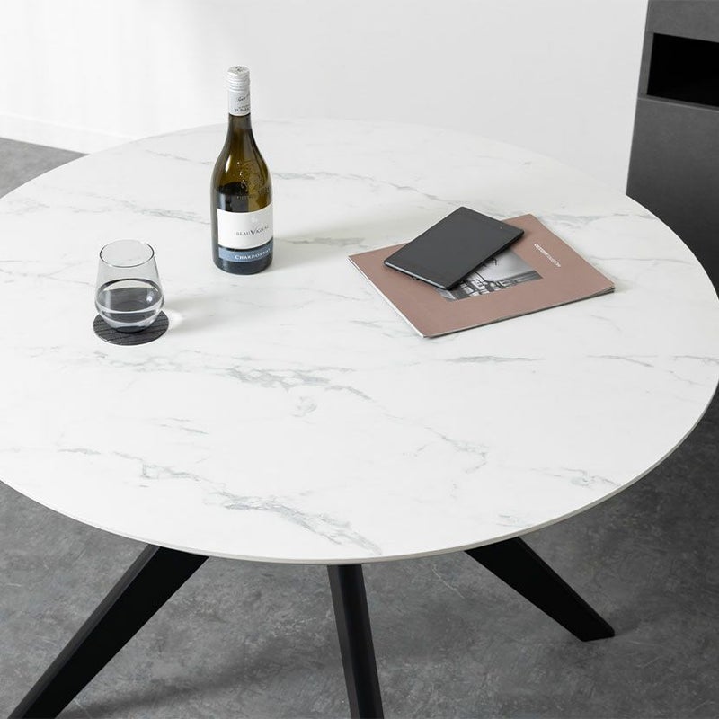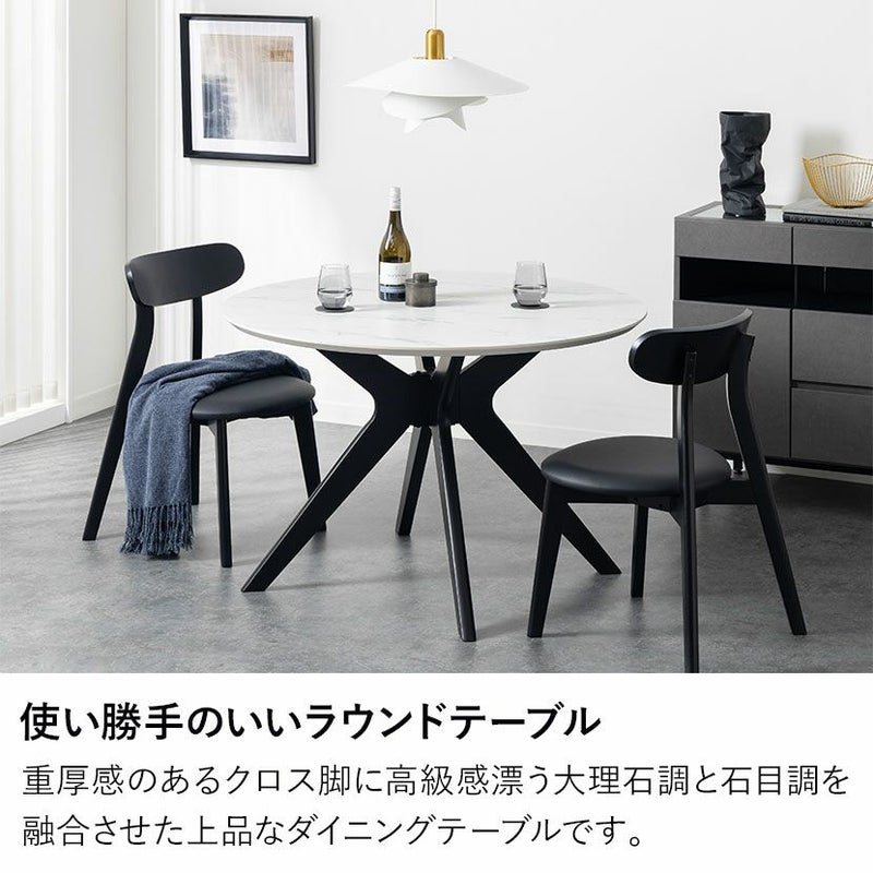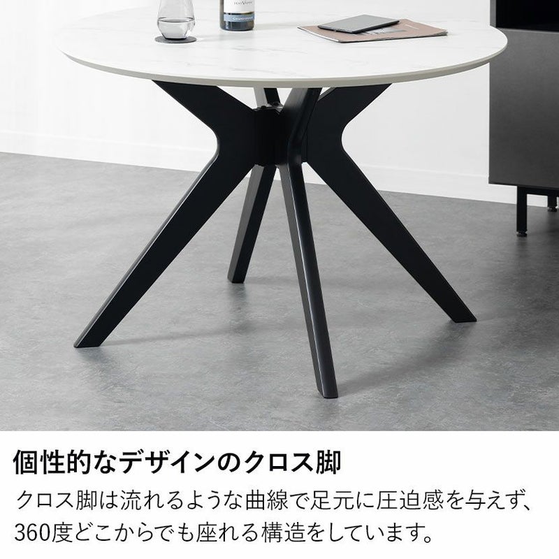 視覚的な圧迫感を与えないスマートな脚部デザインにより、限られたスペースでもお部屋を広く開放的に見せてくれます。また、天板の大理石調や石目調に重厚なブラック脚の組み合わせが、視覚的なメリハリを生み出し空間をグッと引き締めます。