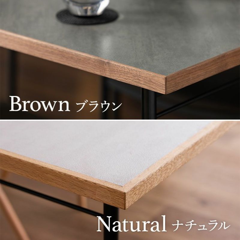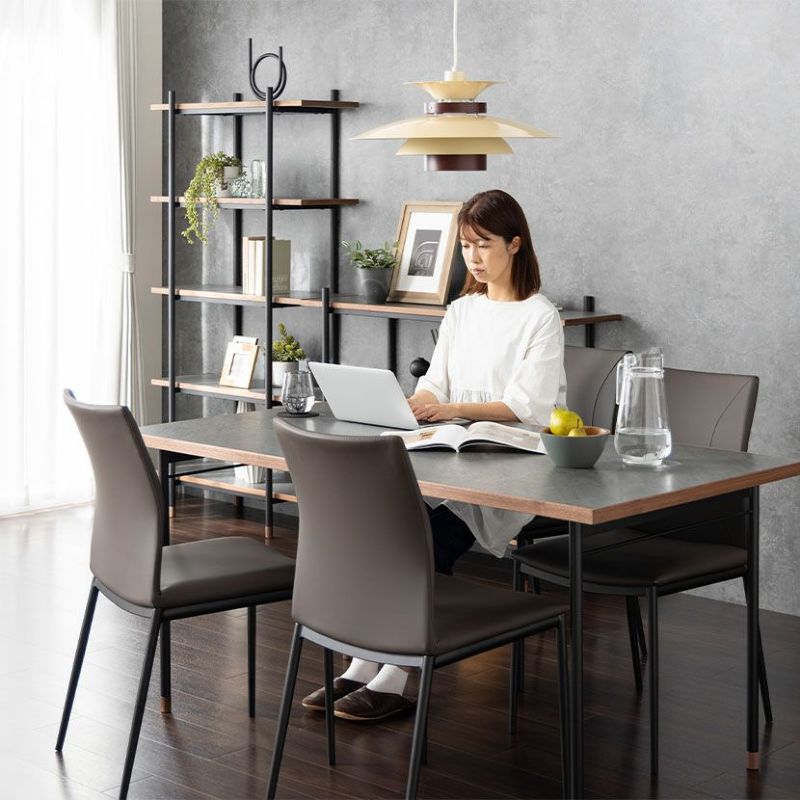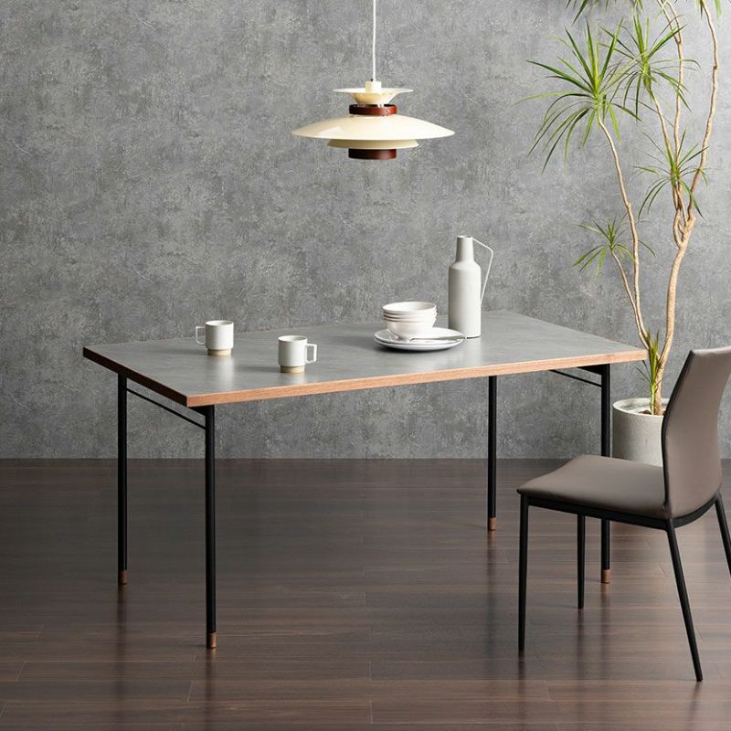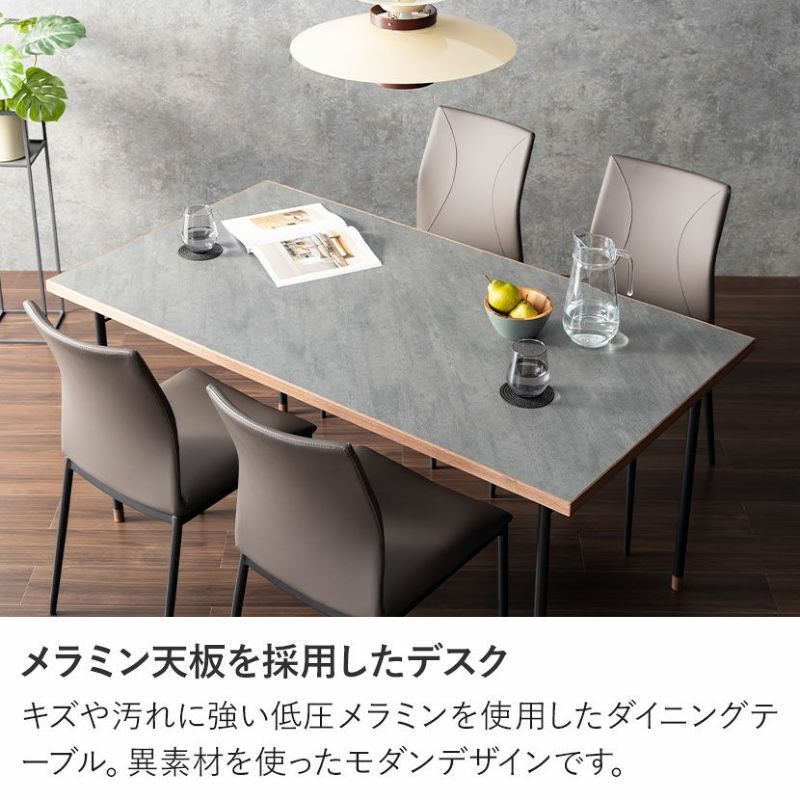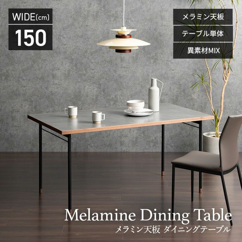 キズや汚れに強い低圧メラミンを使用したダイニングテーブル。異素材を使ったモダンデザインです。