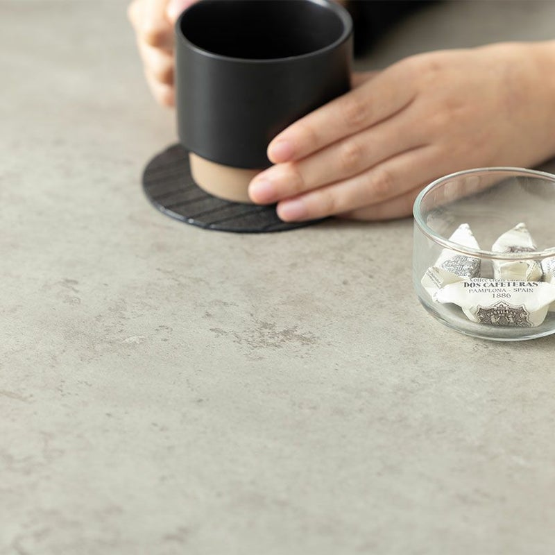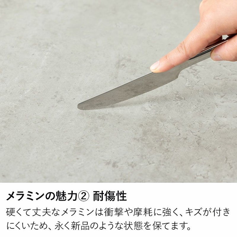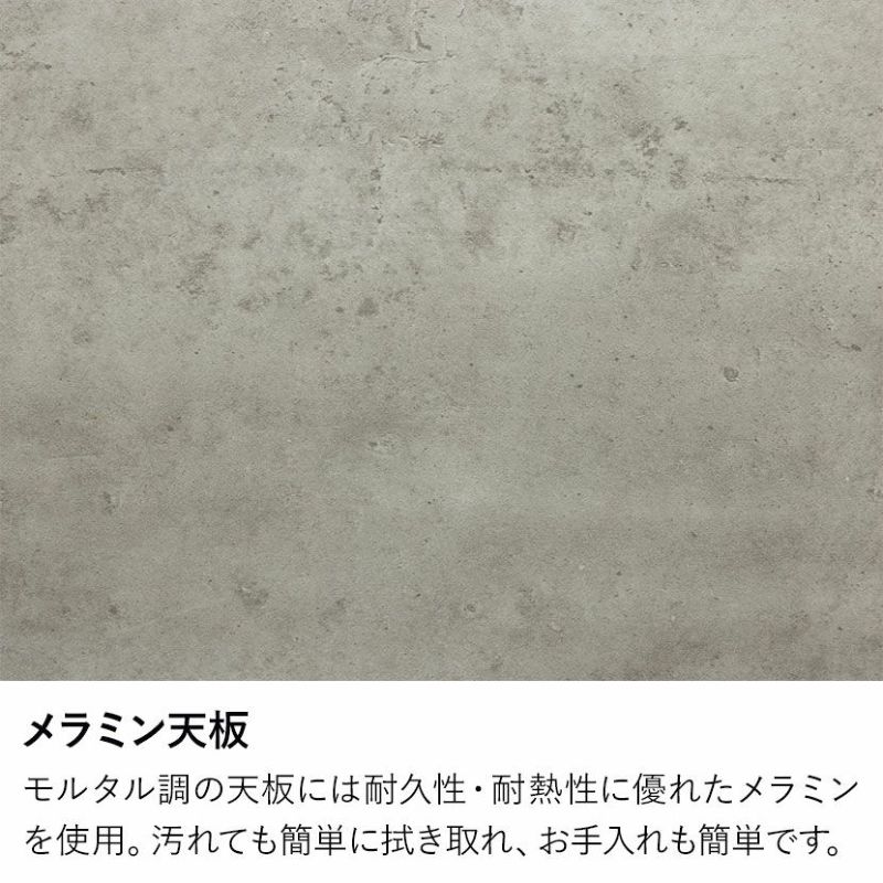 モルタル調の天板には耐久性・耐熱性に優れたメラミンを使用。汚れても簡単に拭き取れ、お手入れも簡単です。