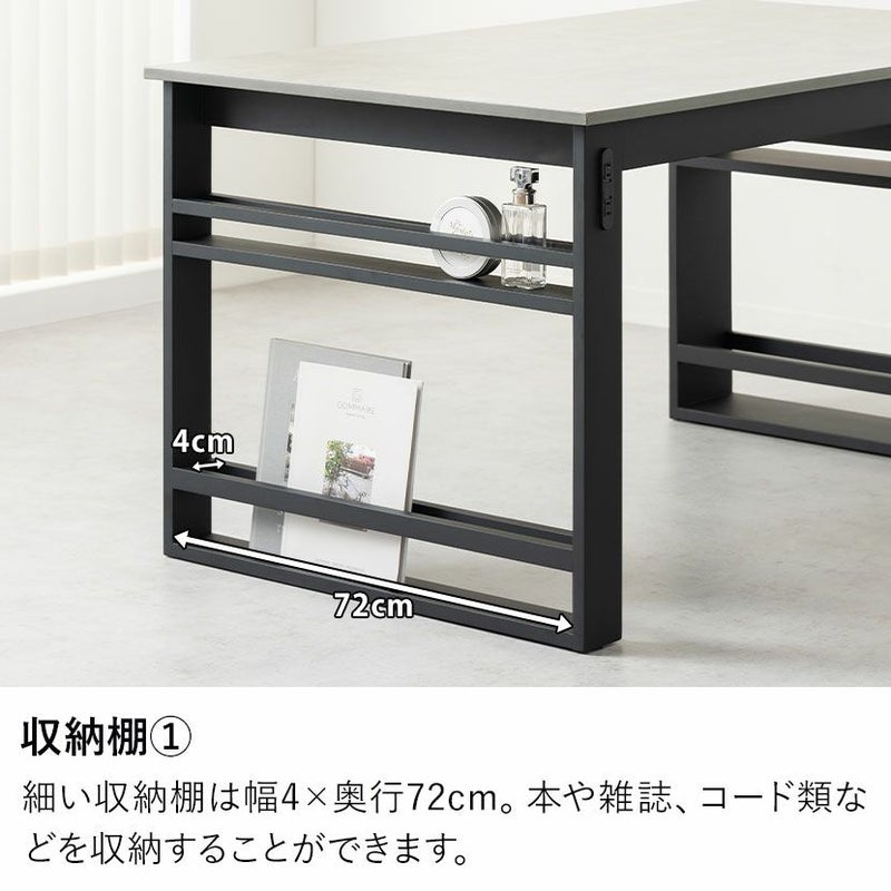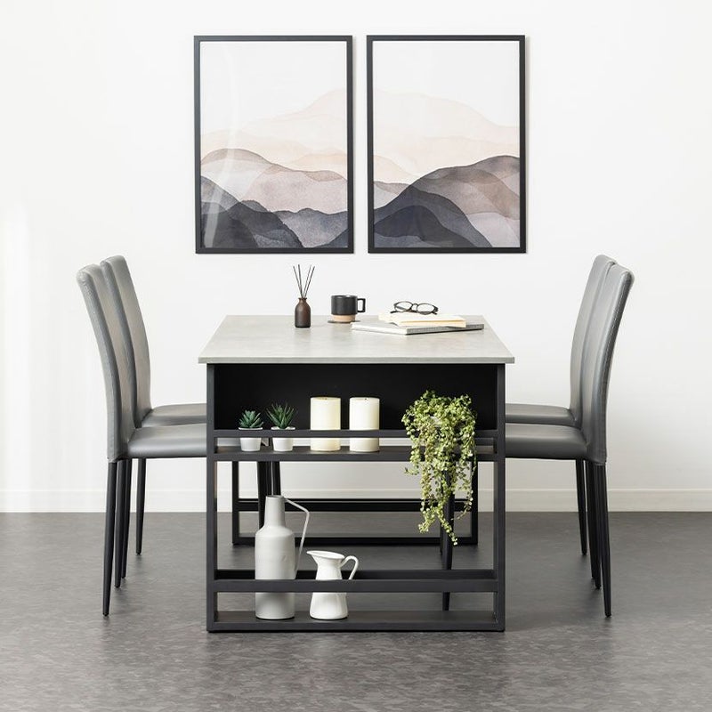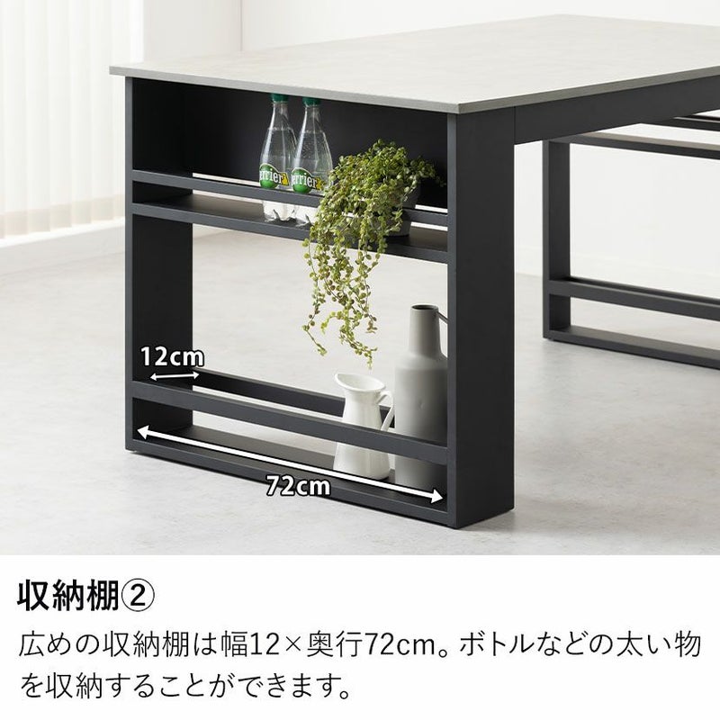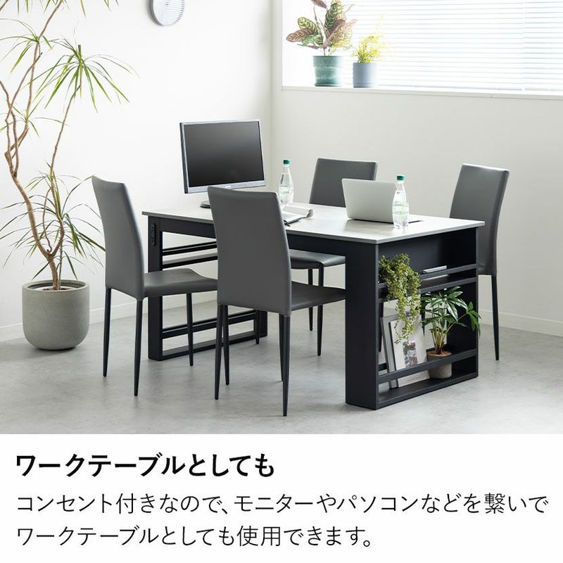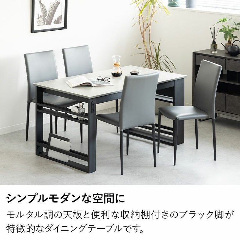 モルタル調の天板と便利な収納棚付きのブラック脚が特徴的なダイニングテーブルです。